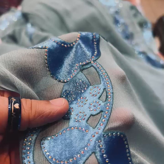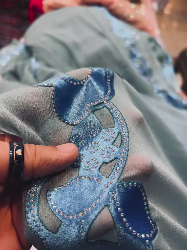This elegant 3-piece suit set features a soft stone velvet fabric with delicate chiffon. The shirt is beautifully crafted with intricate flower applique detailing on both the front and back, ensuring a cohesive and refined look. The lightweight chiffon fabric, measuring 2.5 yards, provides comfort and breathability, perfect for any occasion. The matching soft silk shalwar enhances the overall elegance of the set. Dupatta is also adorned with a stunning flower applique pattern, adding a touch of sophistication to complete the ensemble.