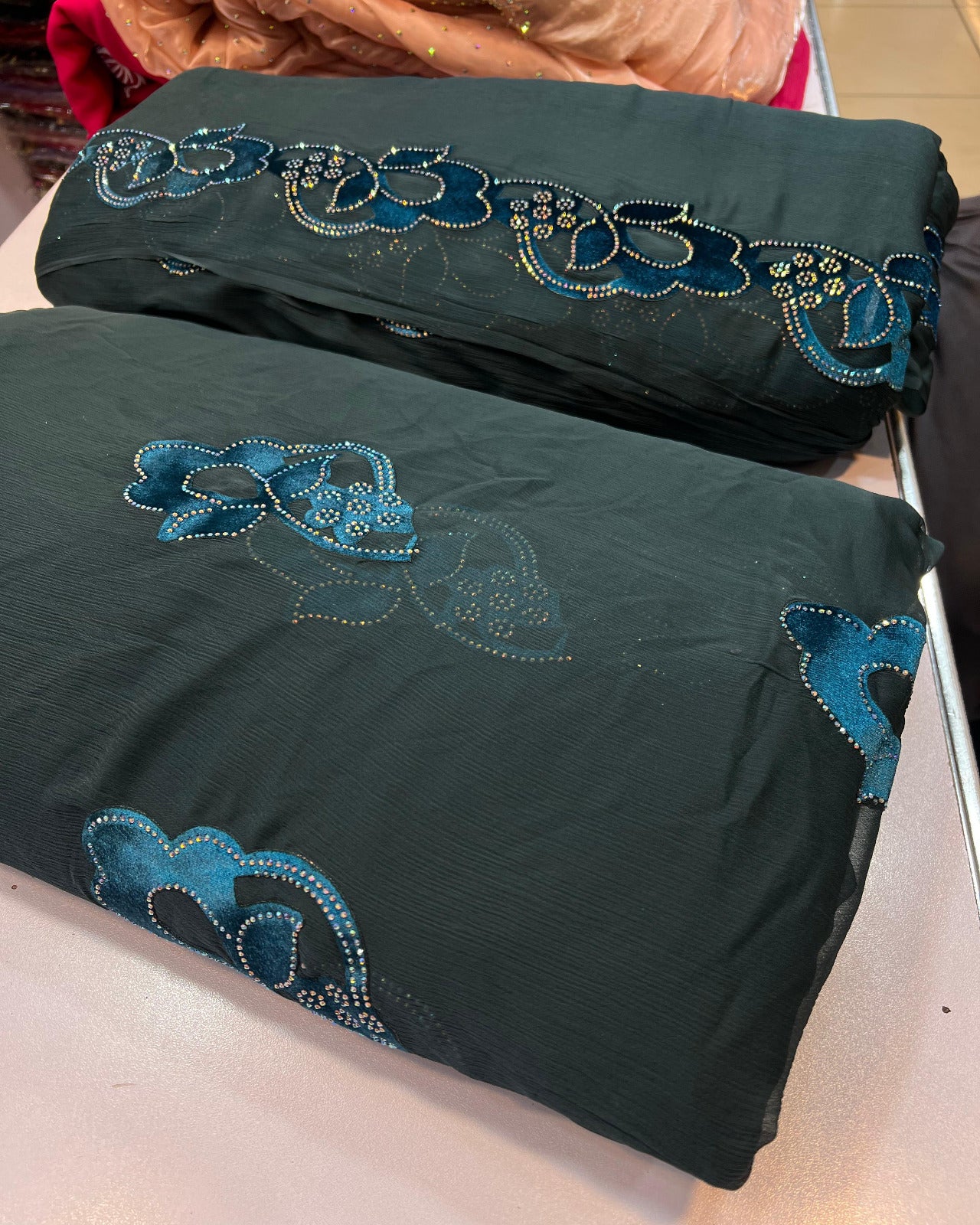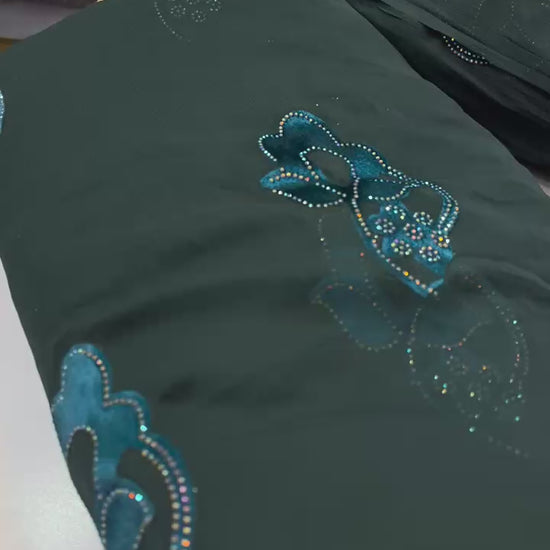 This elegant 3-piece suit set features a soft stone velvet fabric with delicate chiffon. The shirt is beautifully crafted with intricate flower applique detailing on both the front and back, ensuring a cohesive and refined look. The lightweight chiffon fabric, measuring 2.5 yards, provides comfort and breathability, perfect for any occasion. The matching soft silk shalwar enhances the overall elegance of the set. Dupatta is also adorned with a stunning flower applique pattern, adding a touch of sophistication to complete the ensemble.
