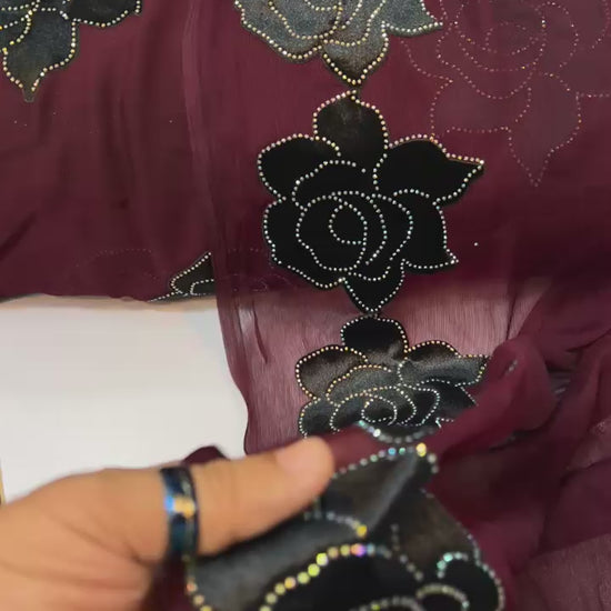 This elegant 3-piece suit set features a soft stone velvet fabric with delicate chiffon. The shirt is beautifully crafted with intricate flower applique detailing on both the front and back, ensuring a cohesive and refined look. The lightweight chiffon fabric, measuring 2.5 yards, provides comfort and breathability, perfect for any occasion. The matching soft silk shalwar enhances the overall elegance of the set. Dupatta is also adorned with a stunning flower applique pattern, adding a touch of sophistication to complete the ensemble.