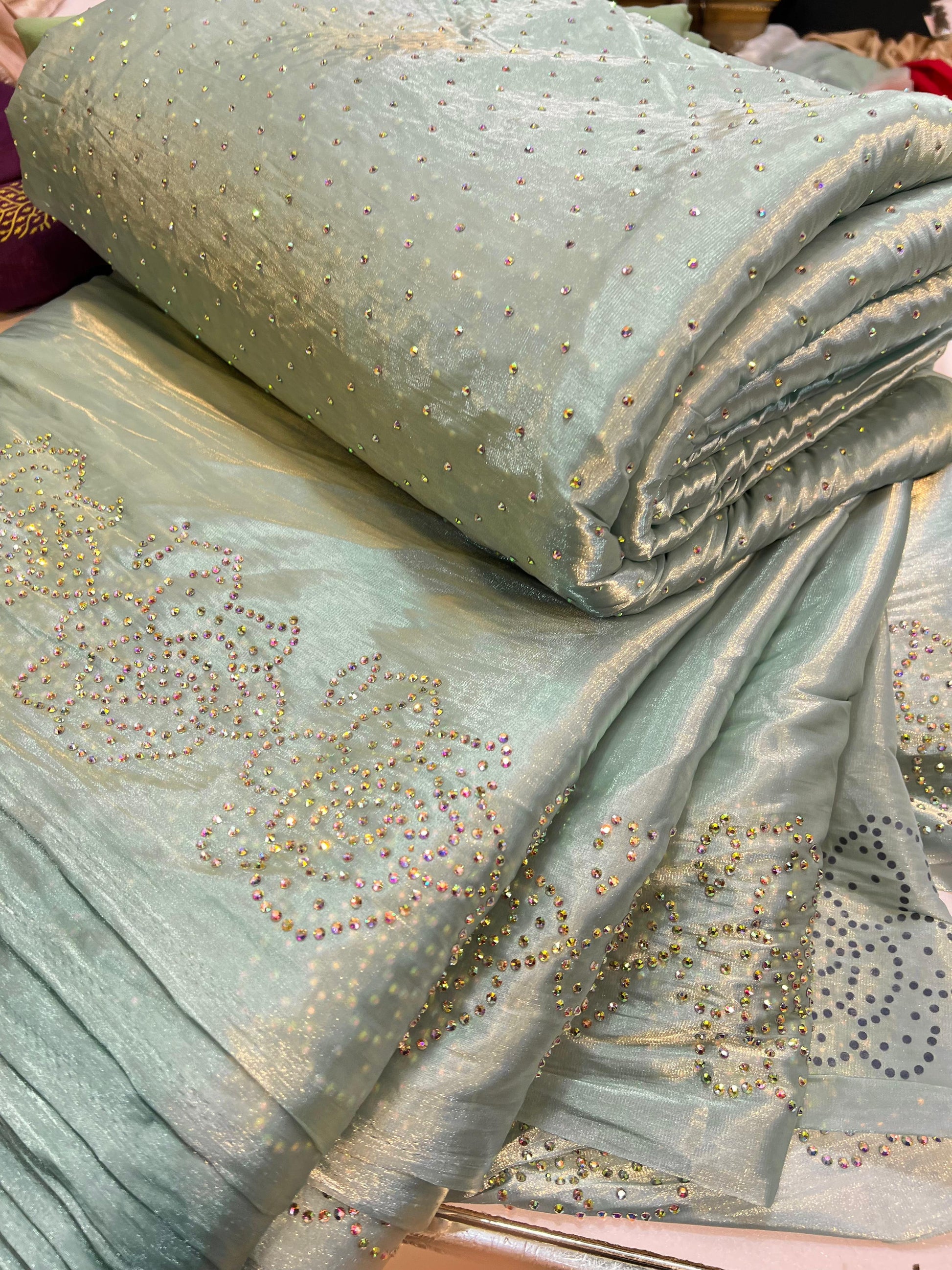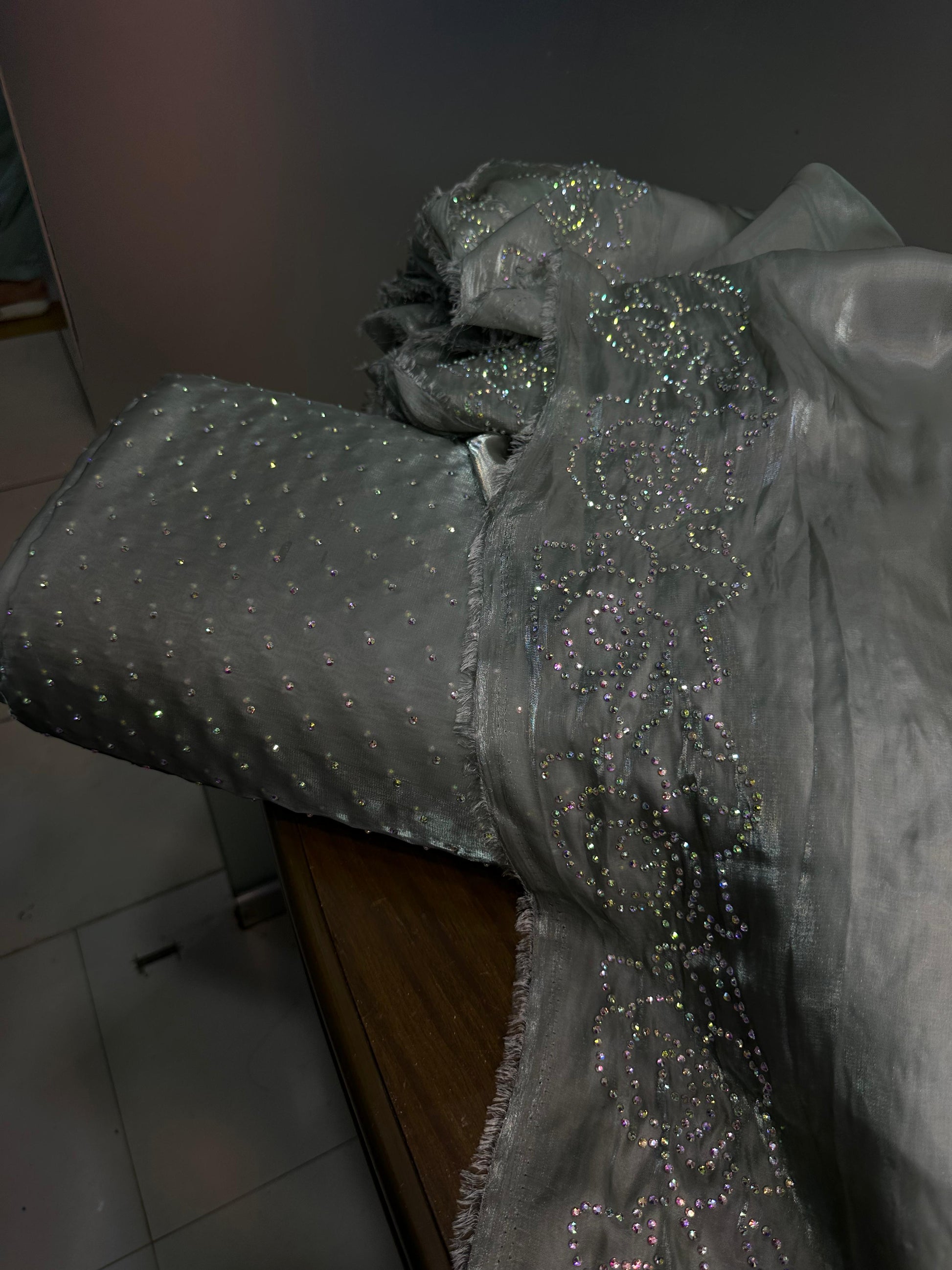 Premium Korean Sheesha Silk 3pc Suit, this suit offers a soft, smooth texture with an exquisite sheen. It features stunning diamond stone embellishments, adding just the right touch of sparkle to your look. The full shirt 2.5 yard is designed with intricate detailing to enhance your silhouette, while the 2.5 yard dupatta with a beautiful flower-cut pattern completes the ensemble. Paired with a soft silk shalwar.