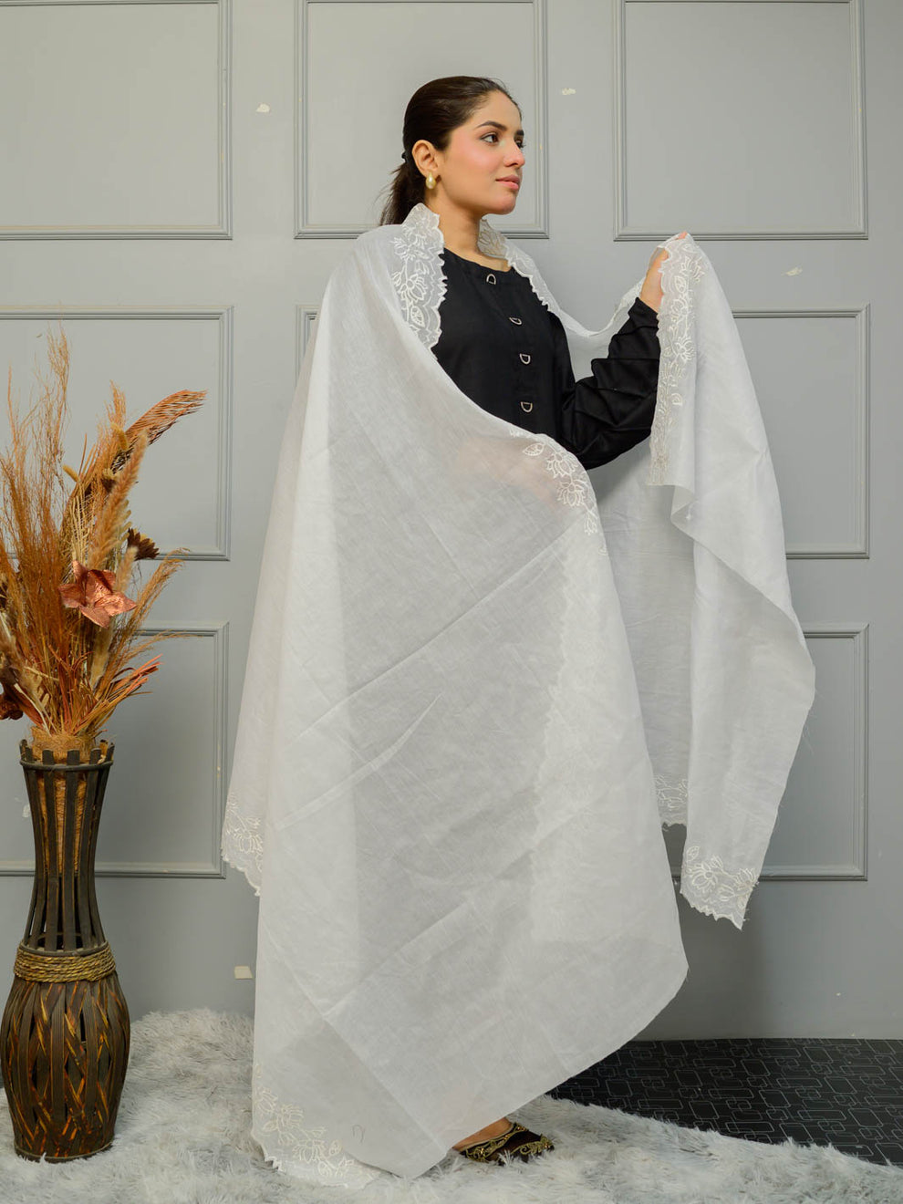 A premium voil lawn cutwork dupatta with delicate embroidery. Measuring 2.5 yard length and 1.25 yard width. The dupatta comes in a white dyeable fabric, allowing customization with your preferred color or design.